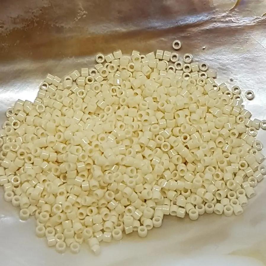 Small cream colored Miyuki Delica Pipe -shaped glass beads with glossy surface.Â