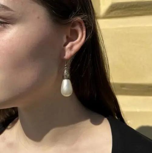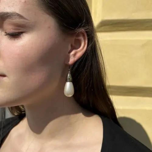 Earrings in silver plated brass with ear hook and pendant of large drop -shaped white imitation pearl.