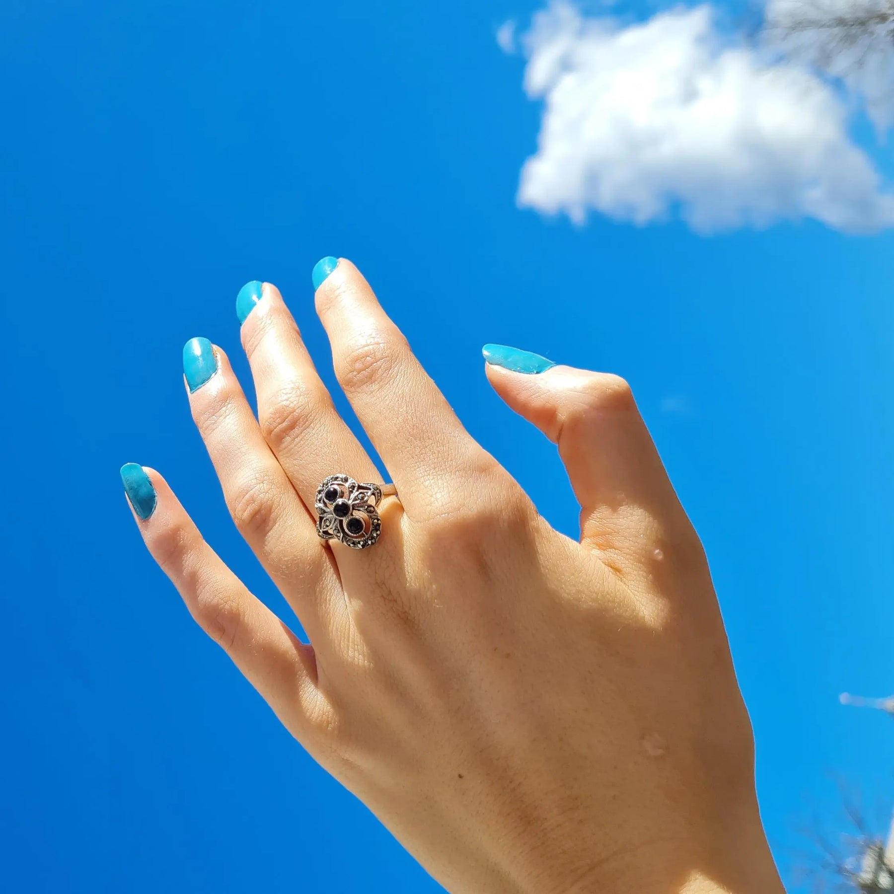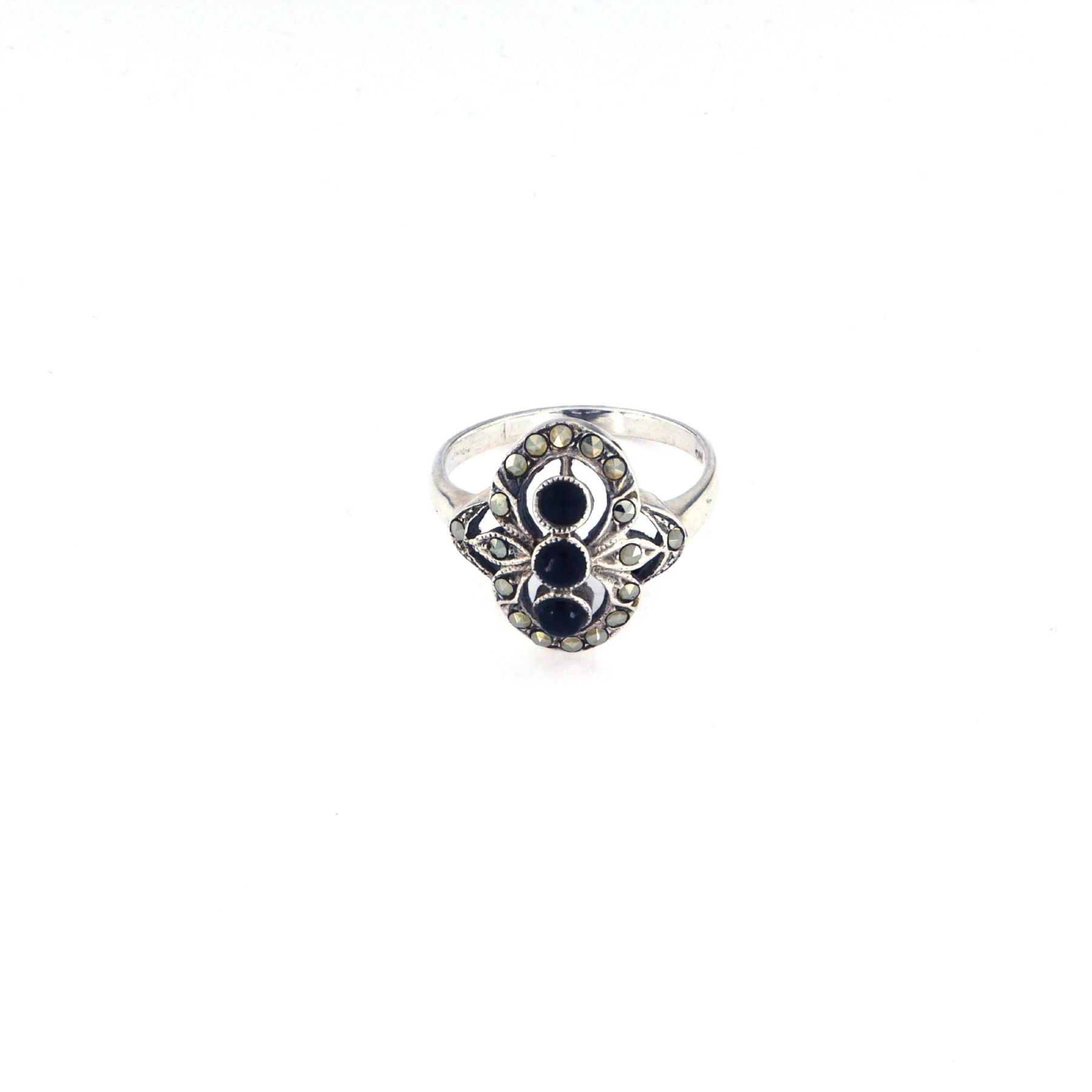 1920s inspired finger ring with three round onyx and small hematite crystals framed in sterling silver.