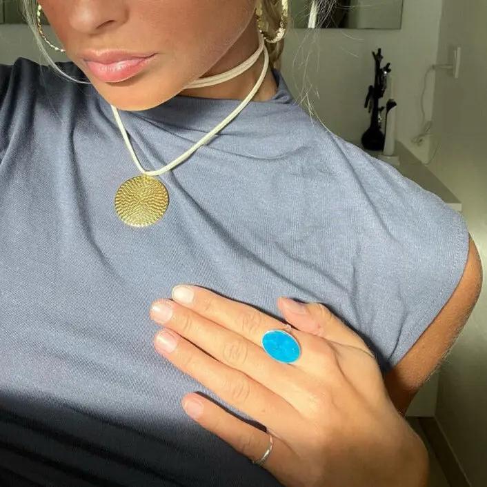 Nice finger ring in minimalist design of sterling silver with a large oval framed turquoise