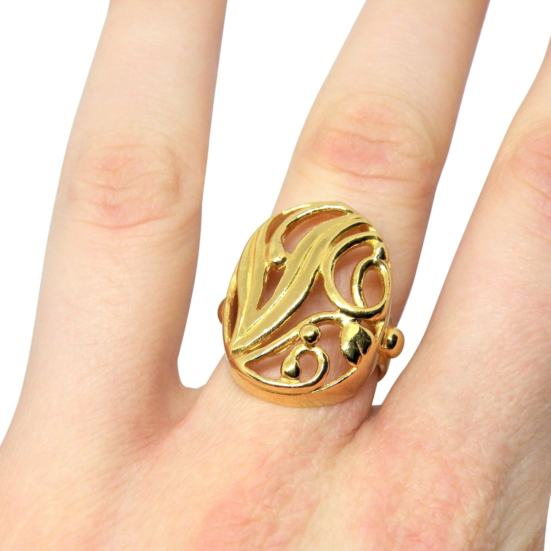 Opdag en chunky, classy fingerring med et skønvirke naturalistisk motiv, der er skabt i sterlingsølv og forgyldt med et tykt lag 18 karat guld, hvilket sikrer langvarig holdbarhed. Denne ring er designet til at være en tidløs tilføjelse til din smykkesamling, fordi livet er for kort til dårlige forgyldninger!