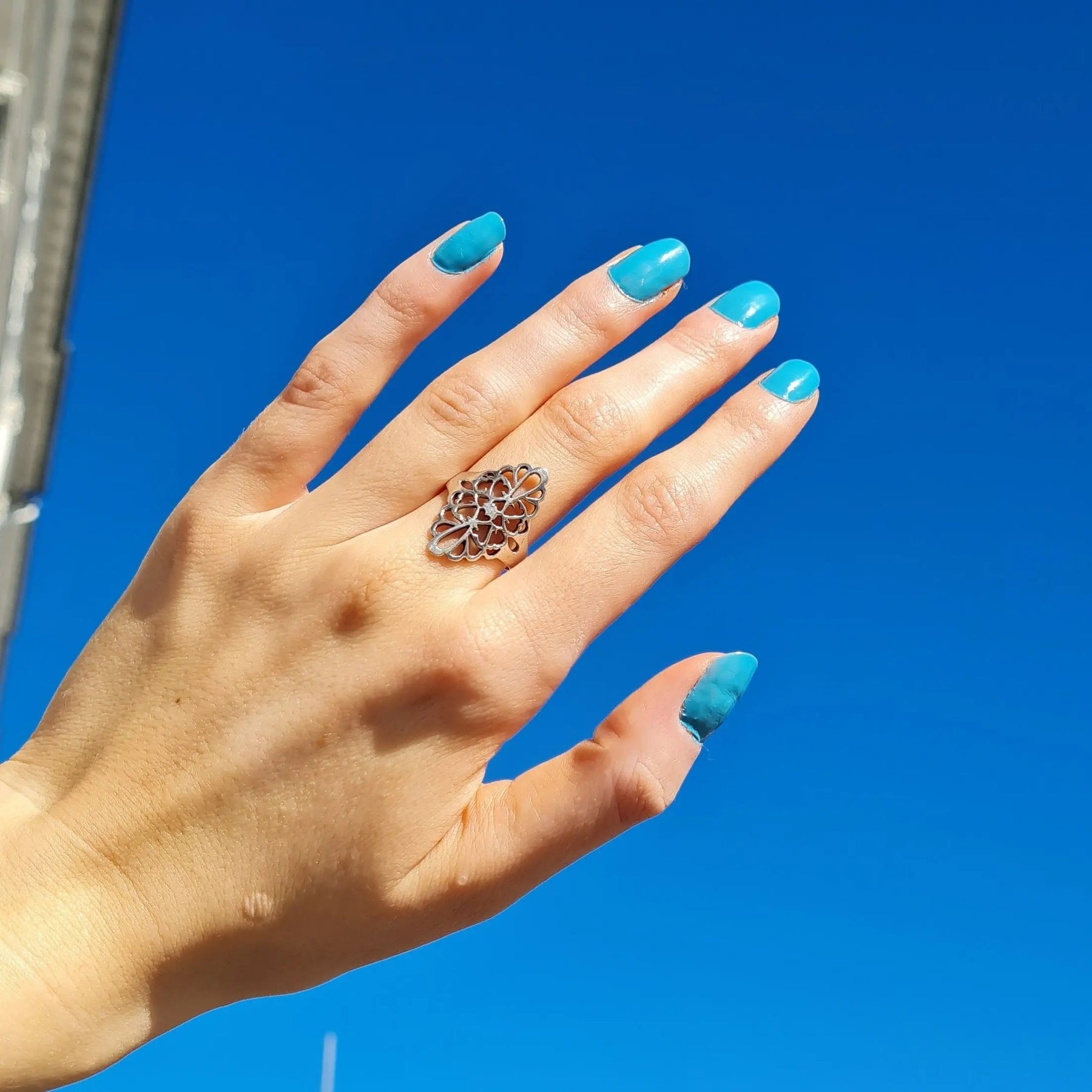 Oplev en elegant fingerring med et smukt blomsterinspireret hulmønster, fremstillet i kvalitets sterlingsølv og forgyldt med et generøst lag 24 karat guld. Denne ring er designet til at holde, fordi livet er for kort til dårlige forgyldninger!