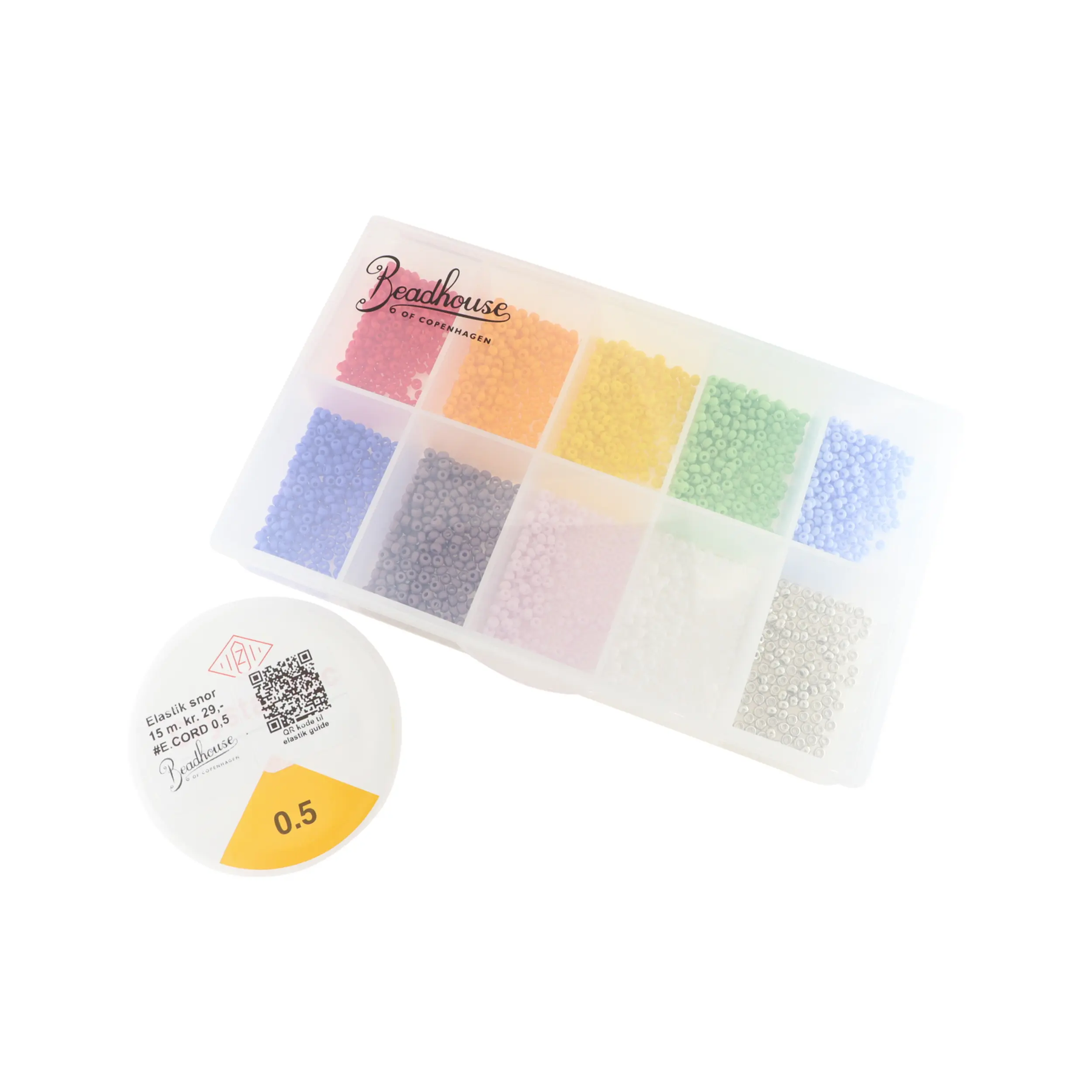 DIY kit, glass beads size 8/0, silver, with opaque beads holding the color