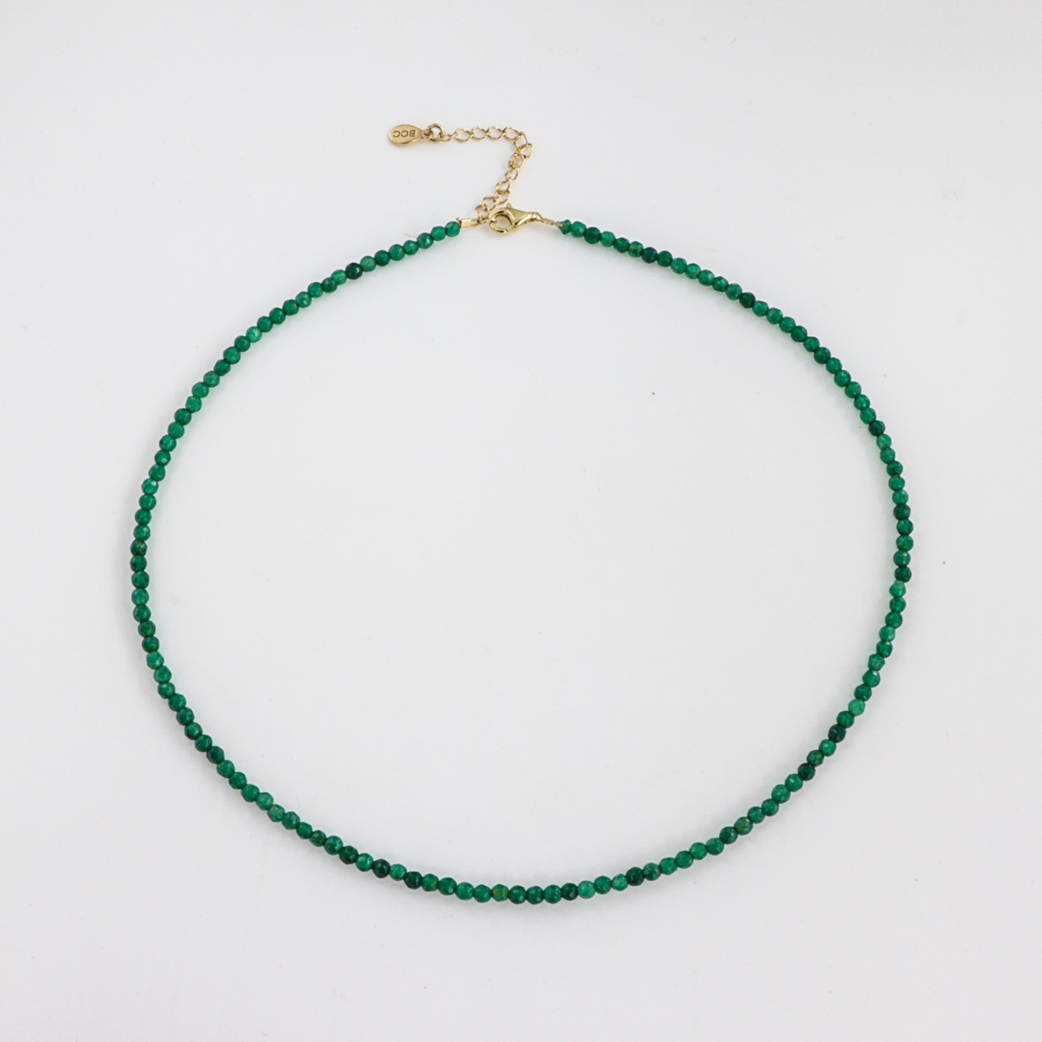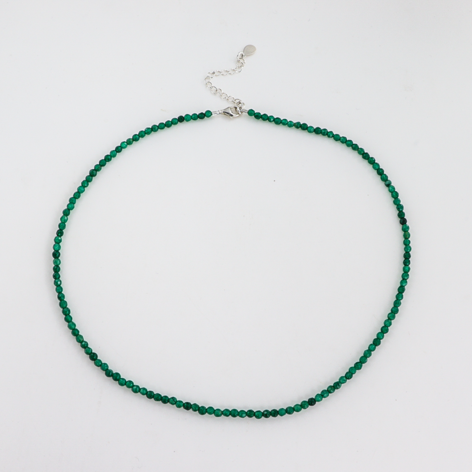 Delikat halskæde i grøn kvarts, bestående af små, runde facetterede perler, der fanger lyset smukt og giver et elegant, let spil. Den støvede grønne farve giver et roligt og naturligt udtryk, som passer perfekt til både hverdag og fest.