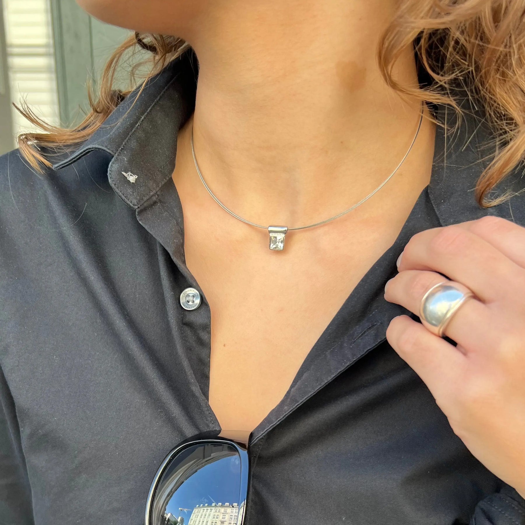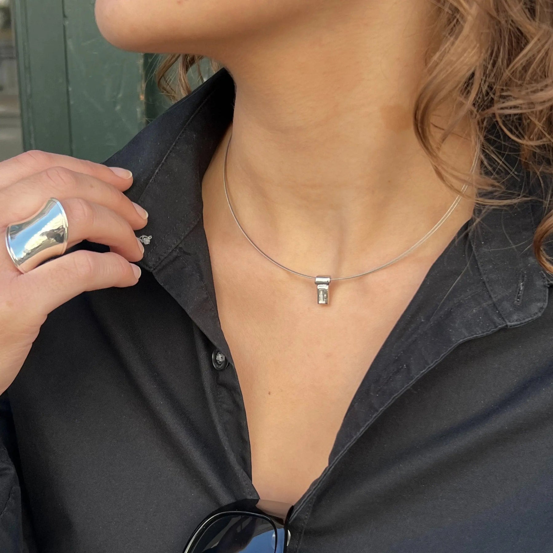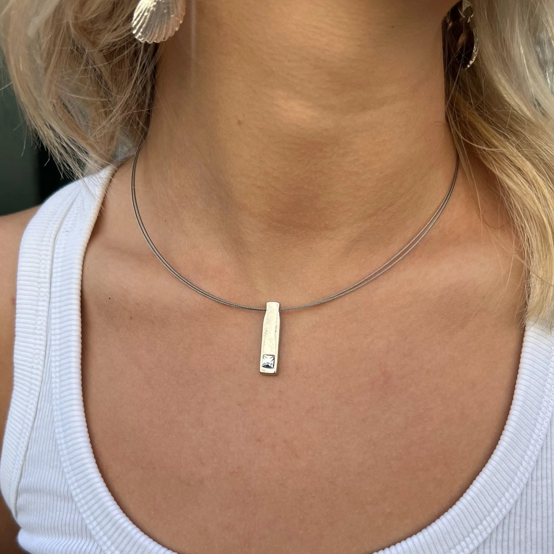 Oplev den perfekte kombination af elegance og enkelhed med dette stilfulde halskæde, der er ideelt til enhver lejlighed. Fremstillet af coated wire i forsølvet messing, tilbyder halskæden et let og moderne udtryk, der smukt omfavner din hals. Det unikke vedhæng, prydet med en krystal, tilføjer et subtilt strejf af luksus, der fanger og reflekterer lyset med en diskret glans.