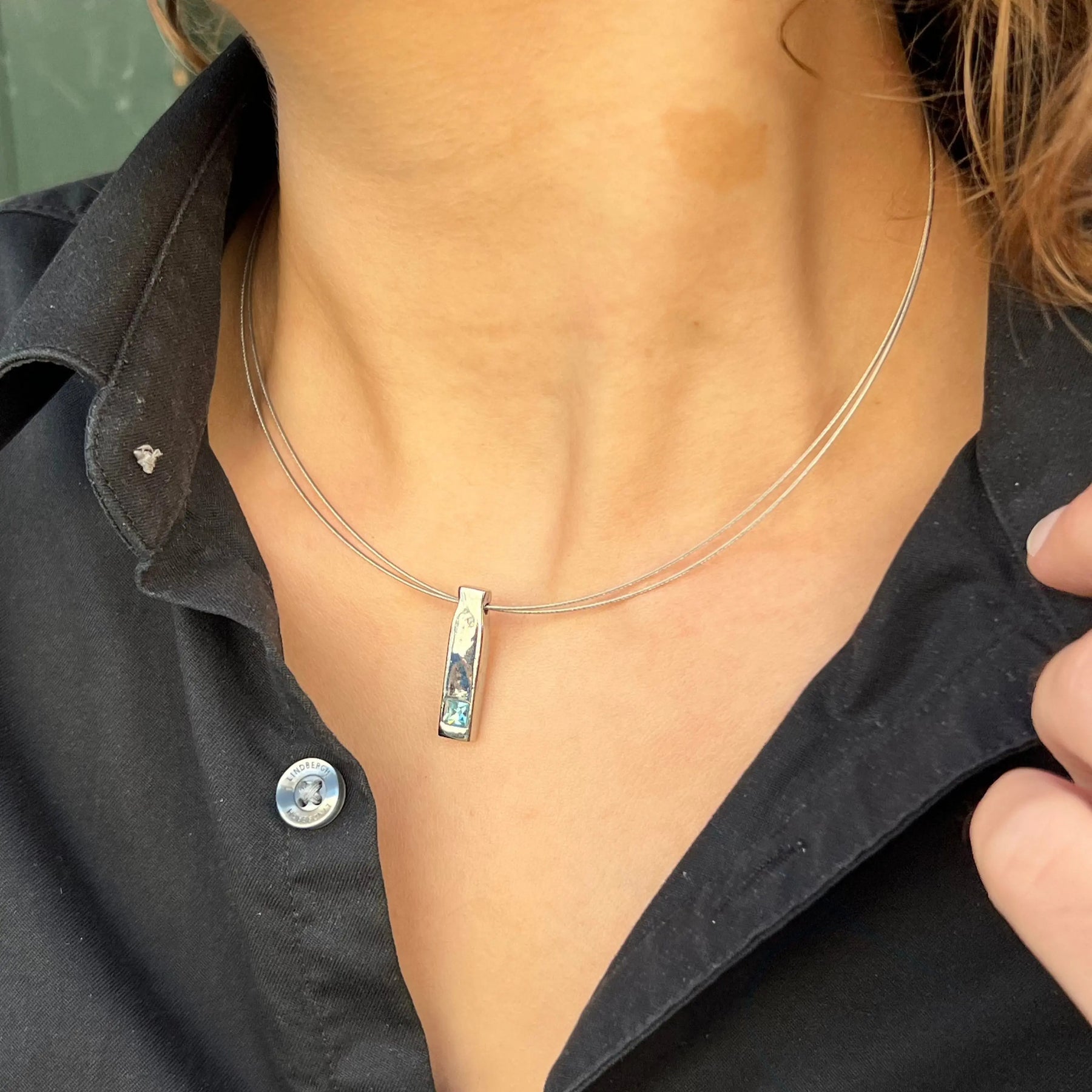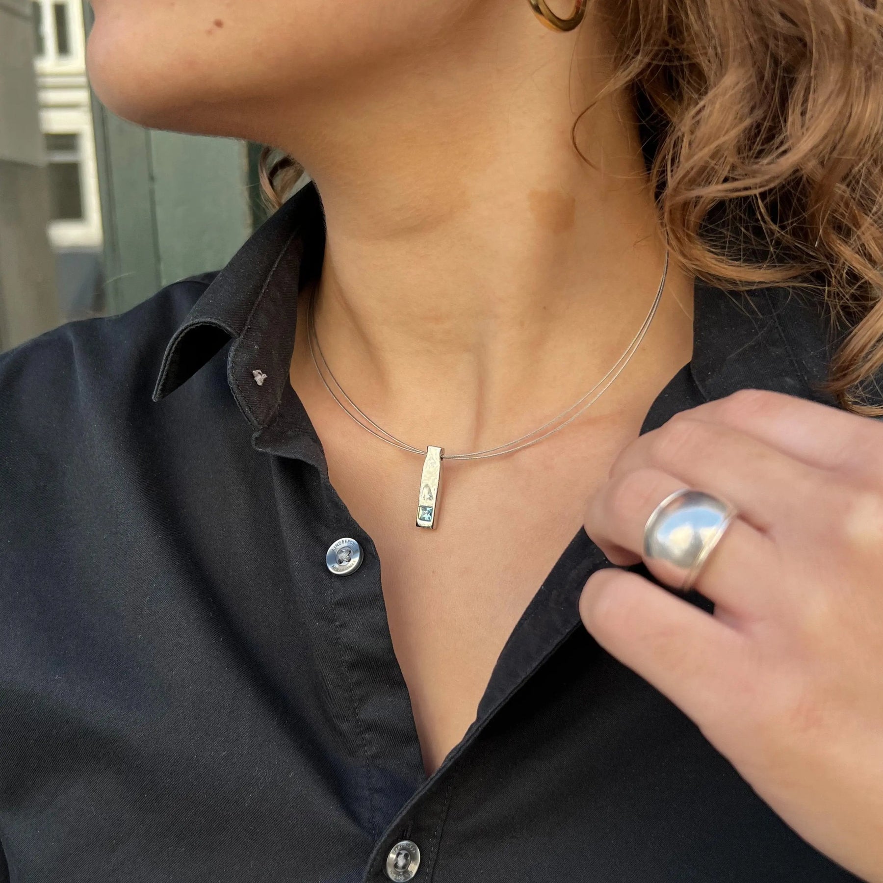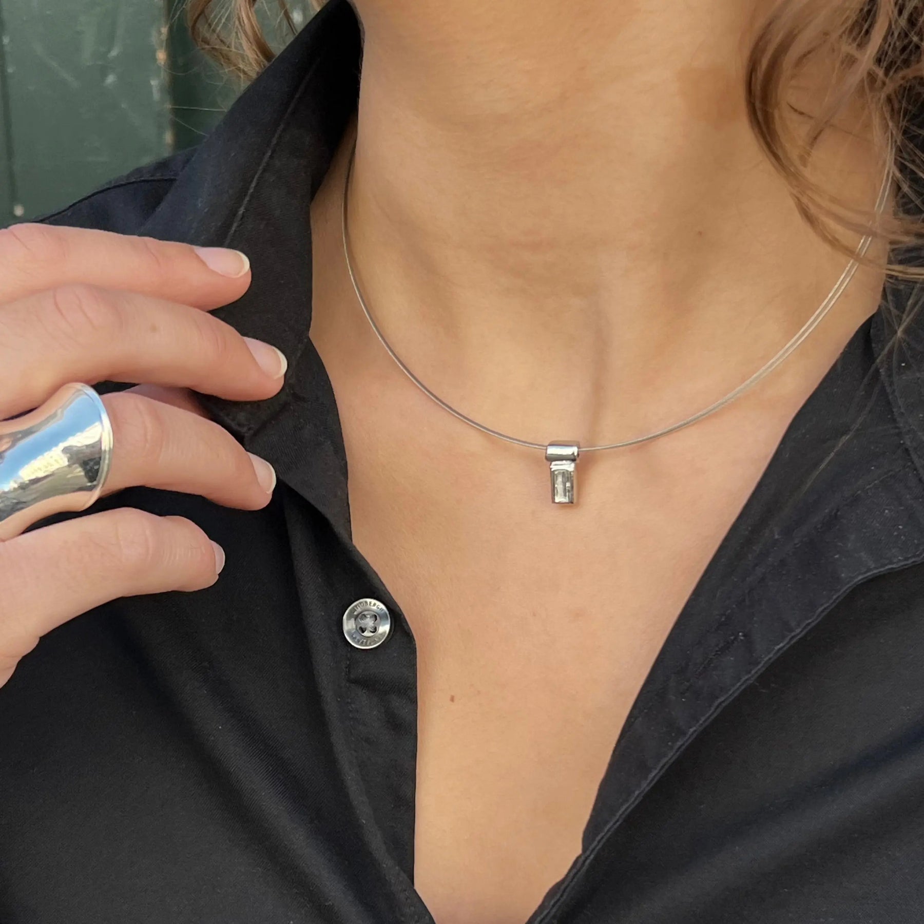 Oplev den perfekte kombination af elegance og enkelhed med dette stilfulde halskæde, der er ideelt til enhver lejlighed. Fremstillet af coated wire i forsølvet messing, tilbyder halskæden et let og moderne udtryk, der smukt omfavner din hals. Det unikke vedhæng, prydet med en krystal, tilføjer et subtilt strejf af luksus, der fanger og reflekterer lyset med en diskret glans.