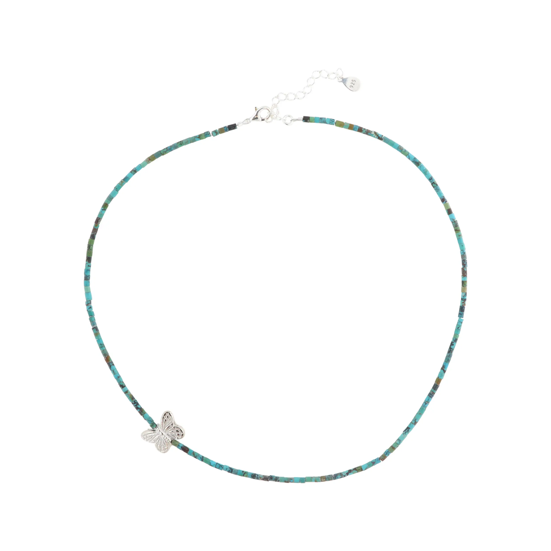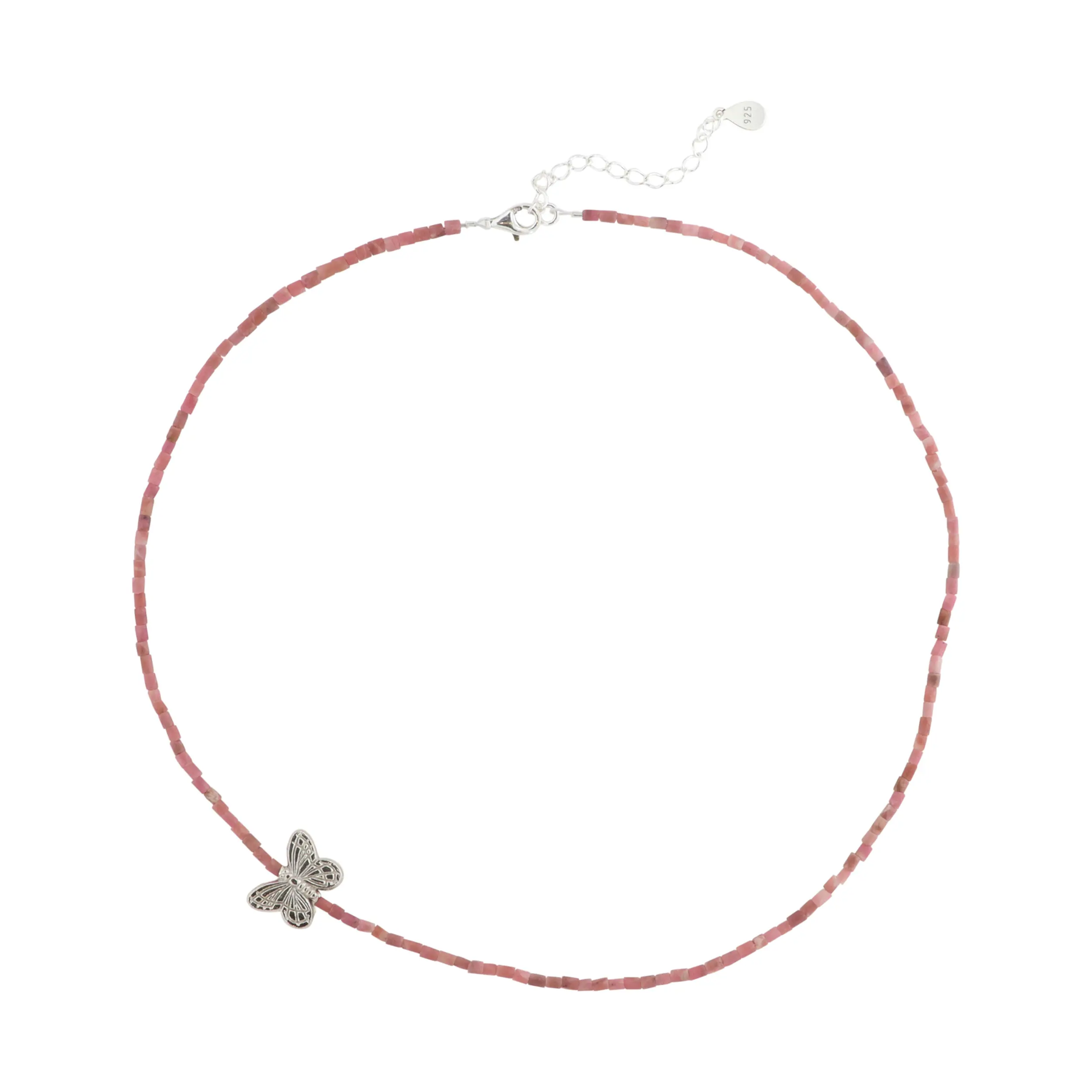 Halskæde med sommerfugl i rhodonit og turkis, sterlingsølv, 40-45 cm