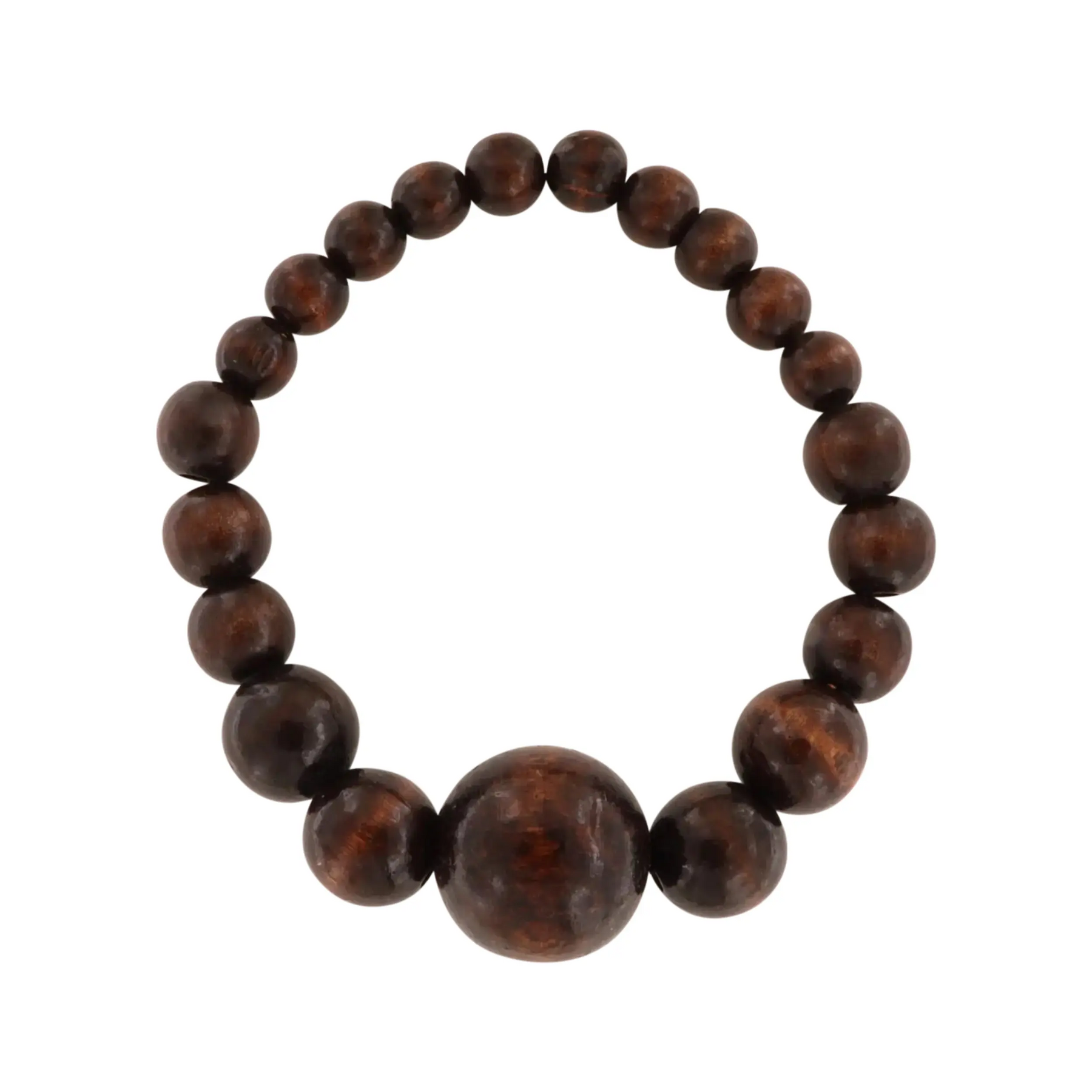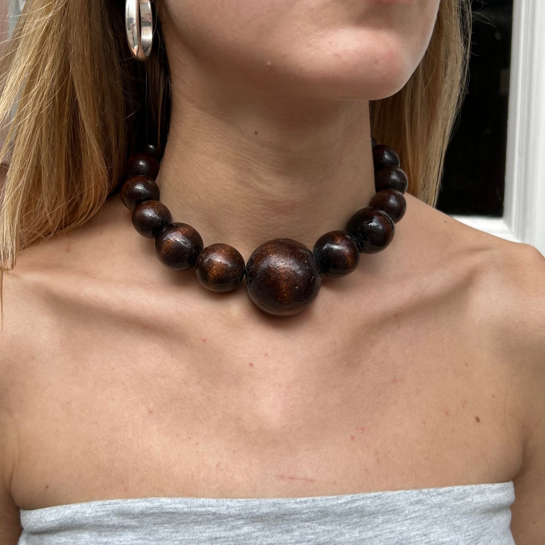 Elegant og iøjnefaldende halskæde med store graduerede træperler, der skaber et smukt og harmonisk udtryk. Halskæden måler 40 cm og er lavet på elastiksnor, hvilket gør den let at tage af og på – og behagelig at bære hele dagen.