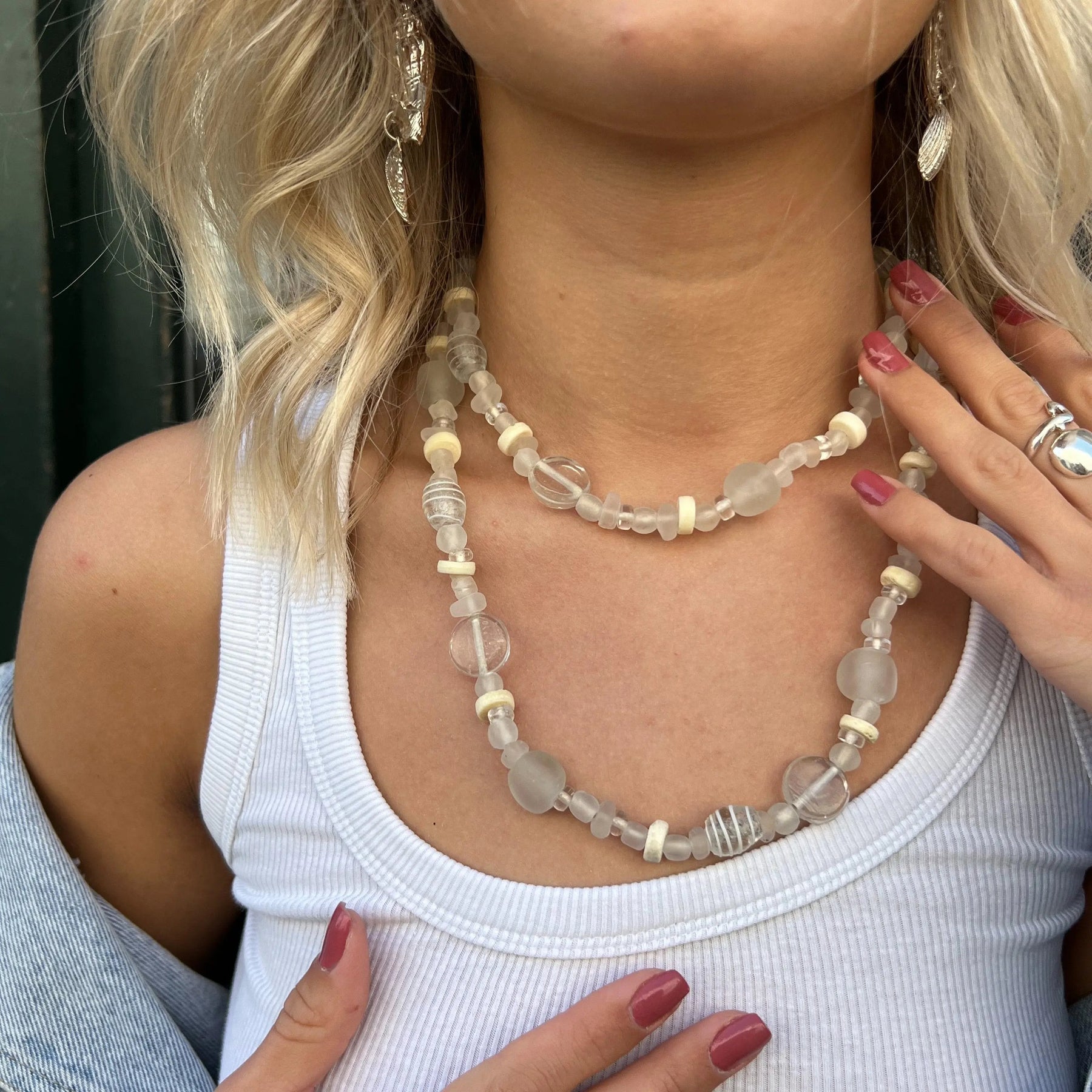 Add a touch of bohemian elegance to your look with this beautiful necklace. The necklace is made of a harmonious blend of glass and leg beads in clear and white shades that give a delicate and natural expression. With a length of 96 cm, the necklace can be worn far for a relaxed look or wrapped twice around the neck for a more full and layered expression.
