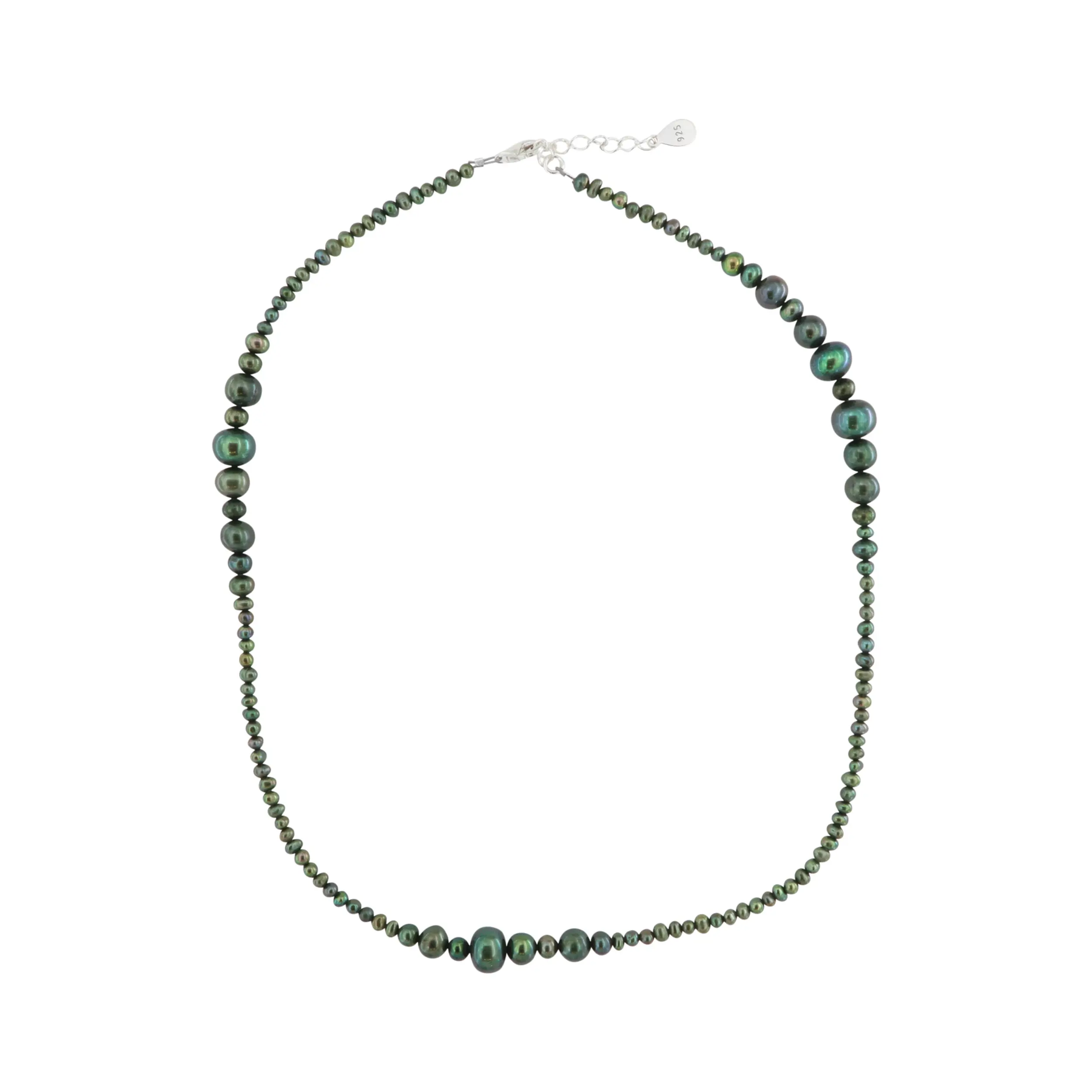 This unique necklace that is a tribute to both Elegance and originality. The design with care, this necklace presents a collection of green freshwater pearls arranged in a conspicuous asymmetrical pattern, which adds a modern twist to the classic pearl necklace.