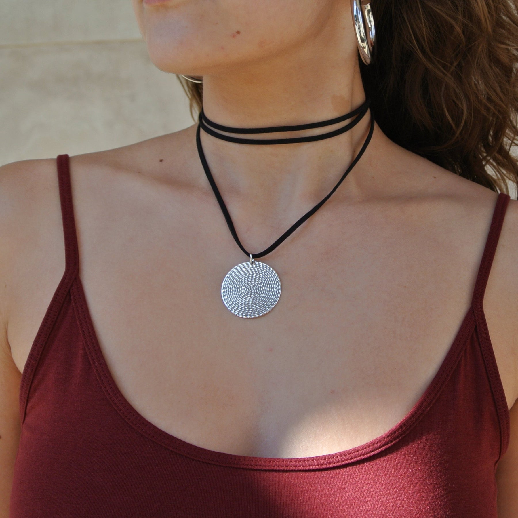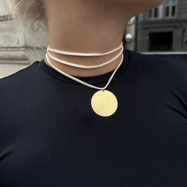 Beautiful and trendy necklace with hammered circle in gilded brass. The necklace is available with black or beige suede cord.
