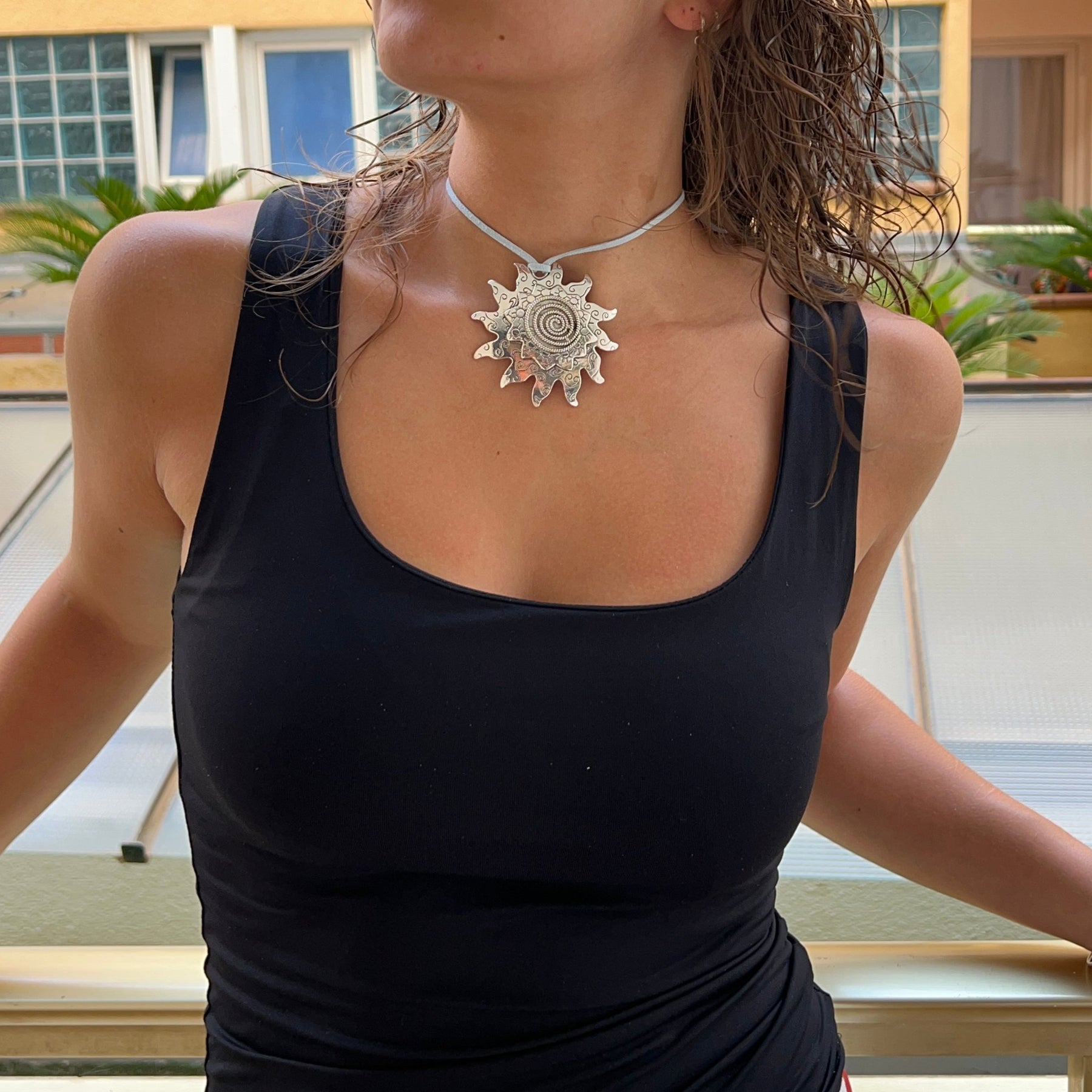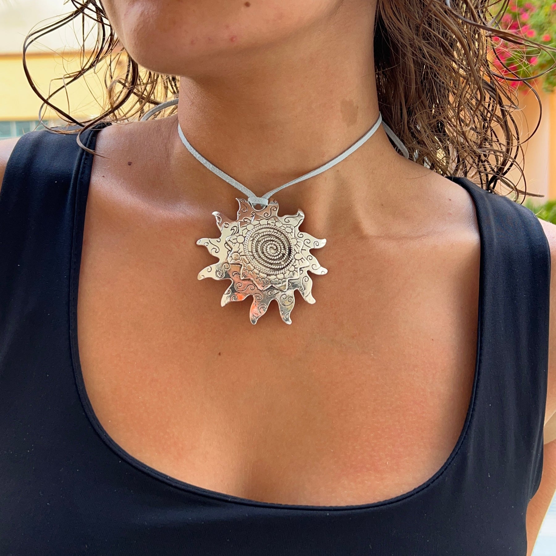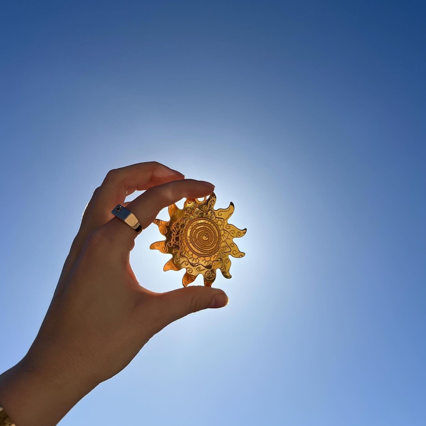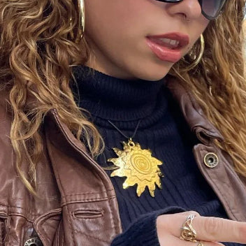 Beautiful and chunky pendant with motif of a large sun, in gilded brass.