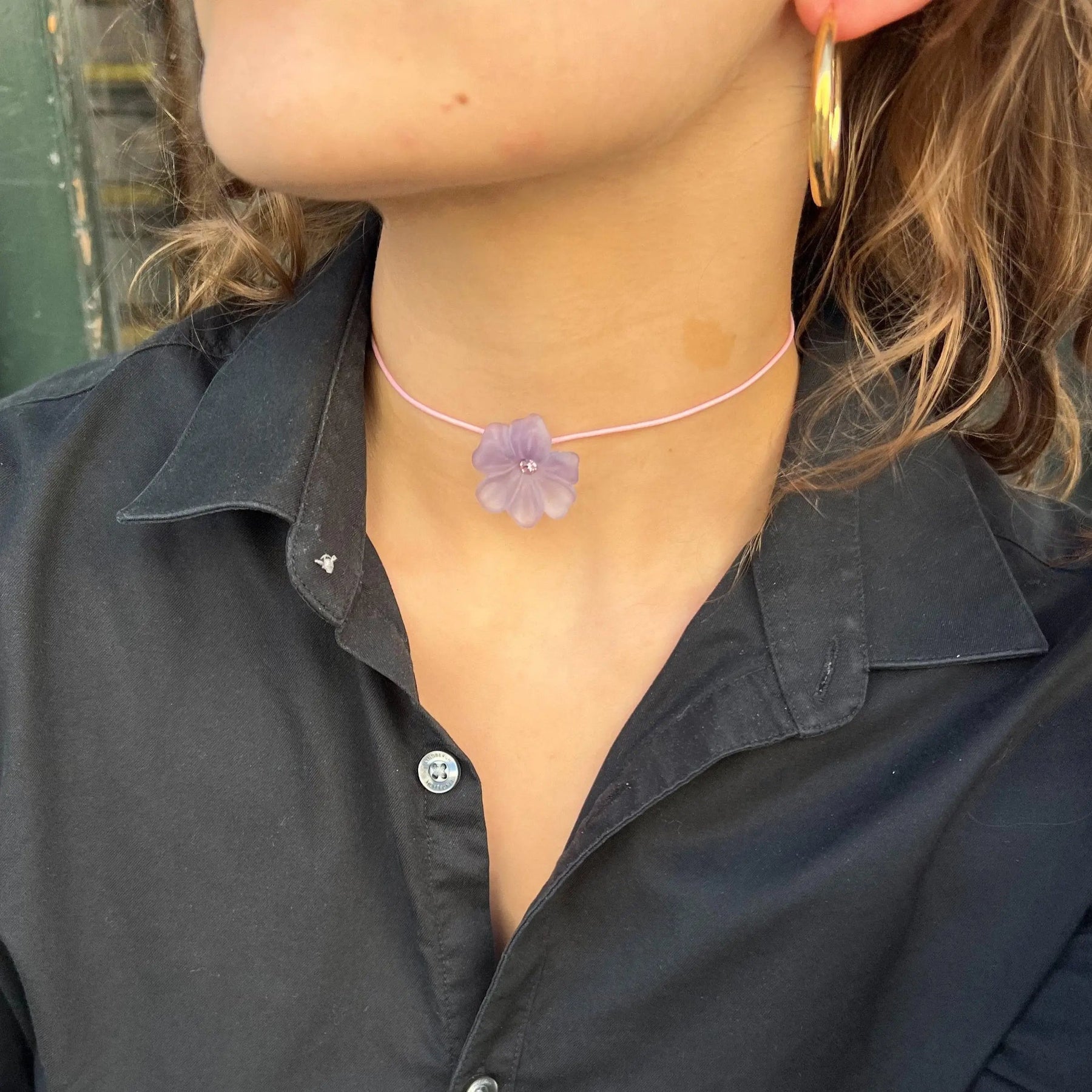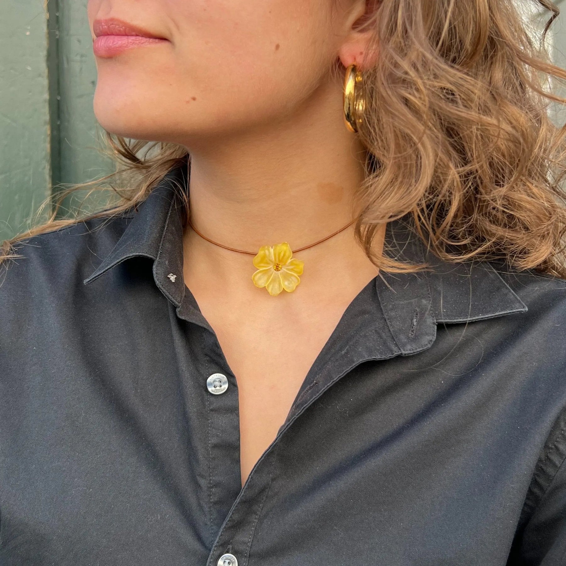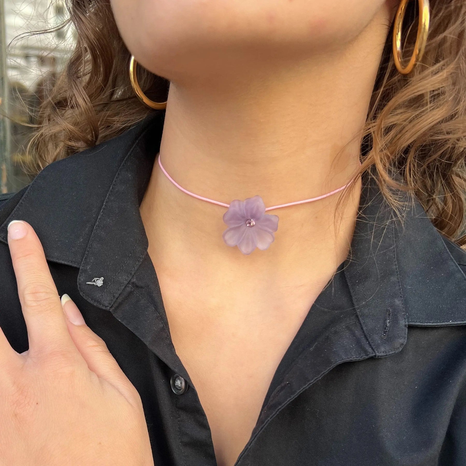 The necklace is available in two variants: a brown leather cord applied to a yellow flower with orange stone, or a pink string applied a purple flower with purple stone. A single and charming jewelry that fits both everyday and festive occasions.