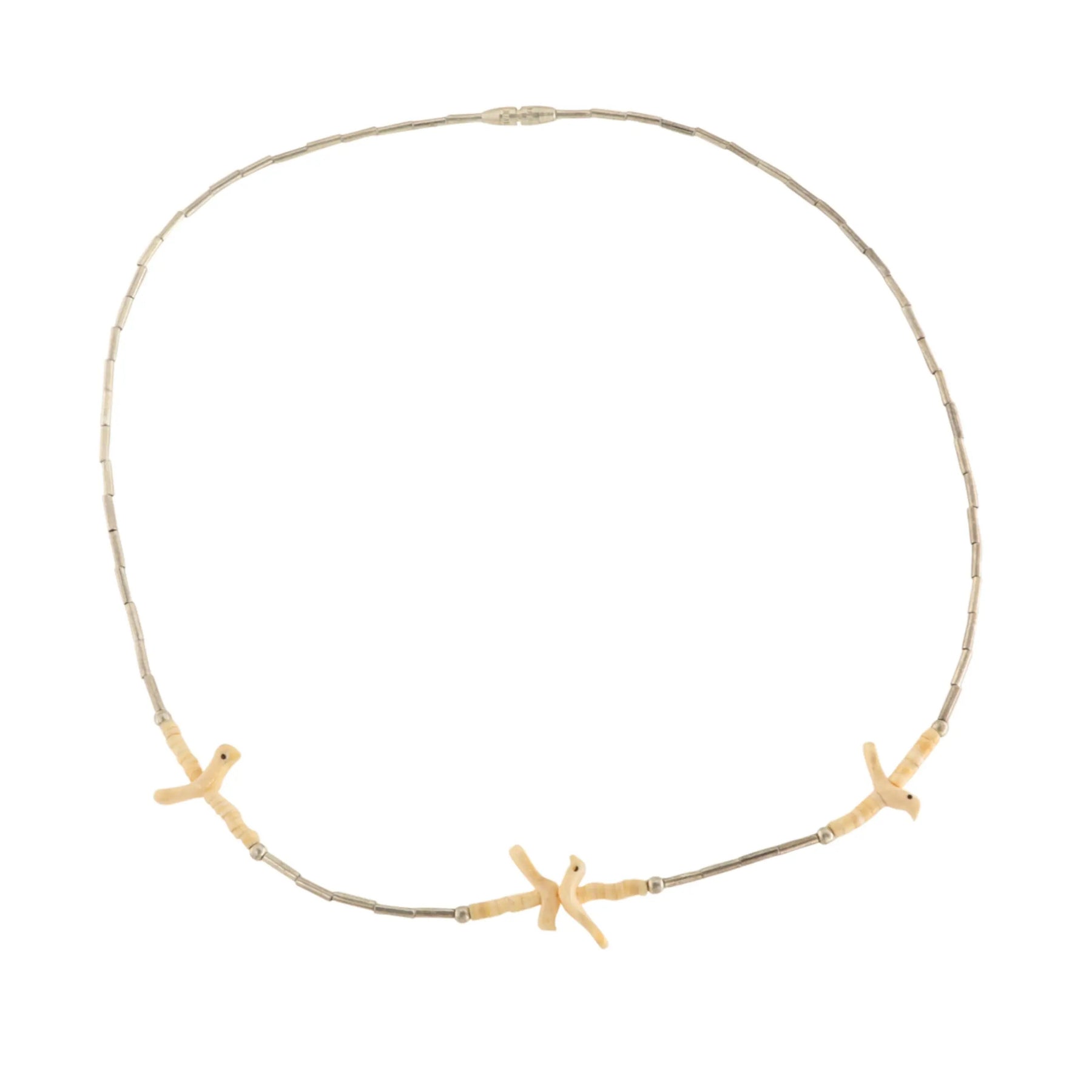 3. Rondel leg beads and birds necklace: Surveying 42 cm, this variant is uniquely designed with round leg beads and small birds that add a playful and ethnic touch to the necklace.