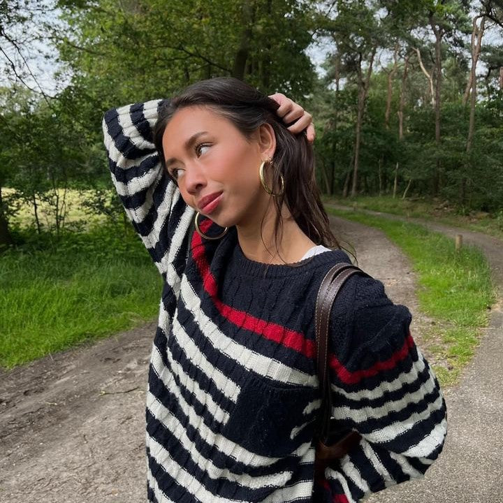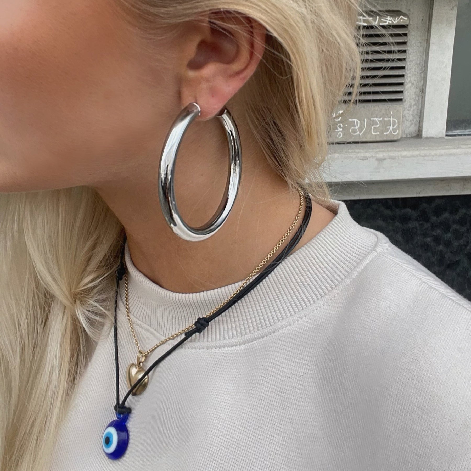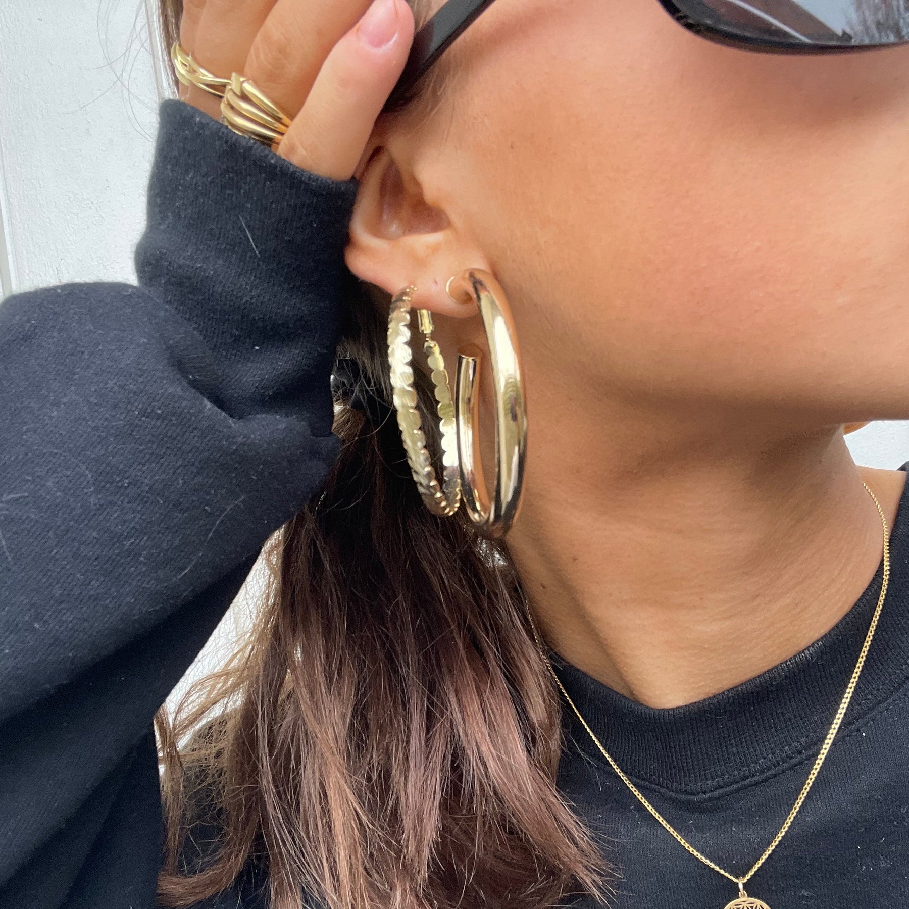 Oplev vores stilfulde chunky hoops i messing, tilgængelige med en luksuriøs forgyldning eller en elegant sølvfinish. Disse øreringe er designet til at tilføje et moderne touch til dit look, uanset om det er til hverdag eller fest. Med en diameter på 60 mm og en tykkelse på 6 mm, er de perfekte til at skabe et statement.
