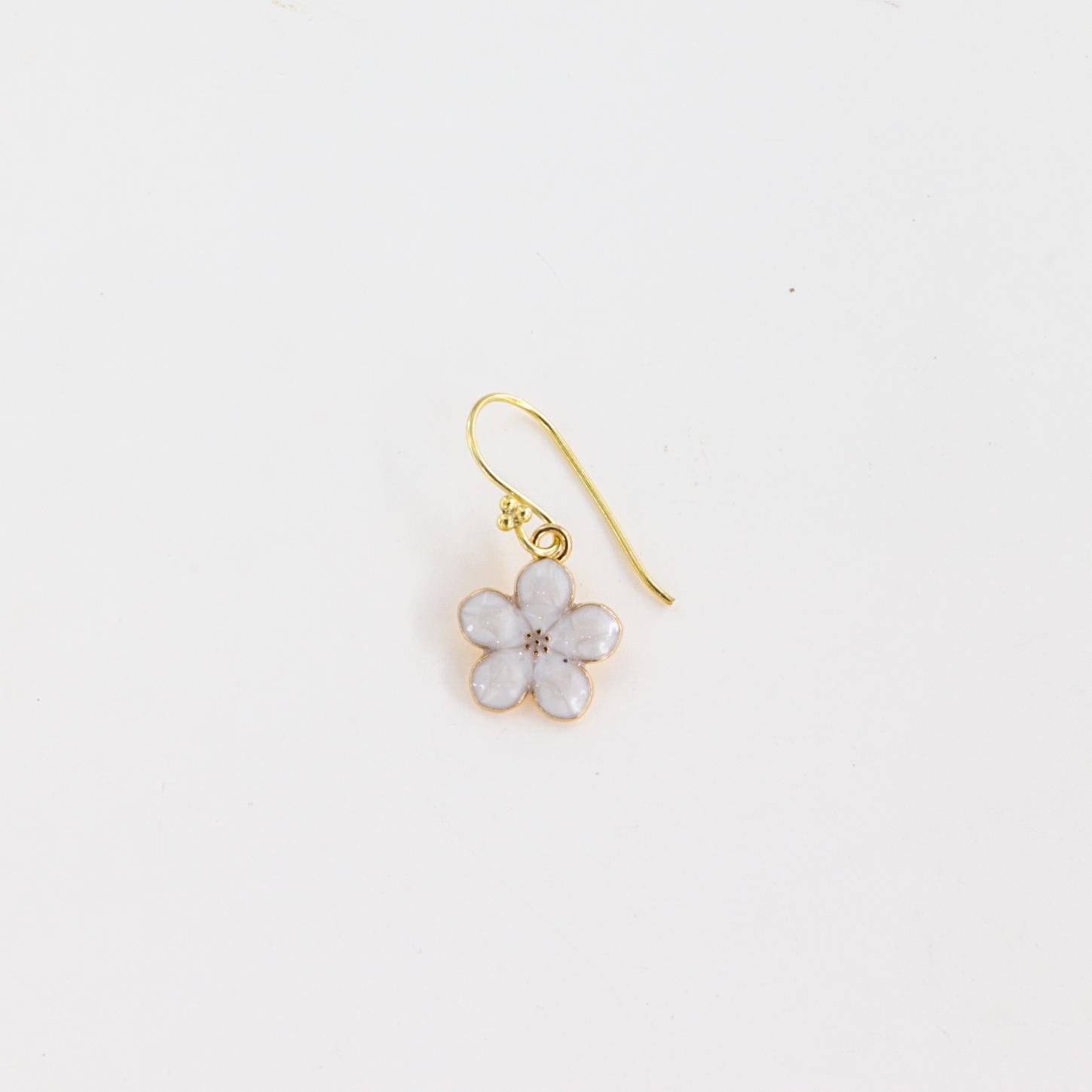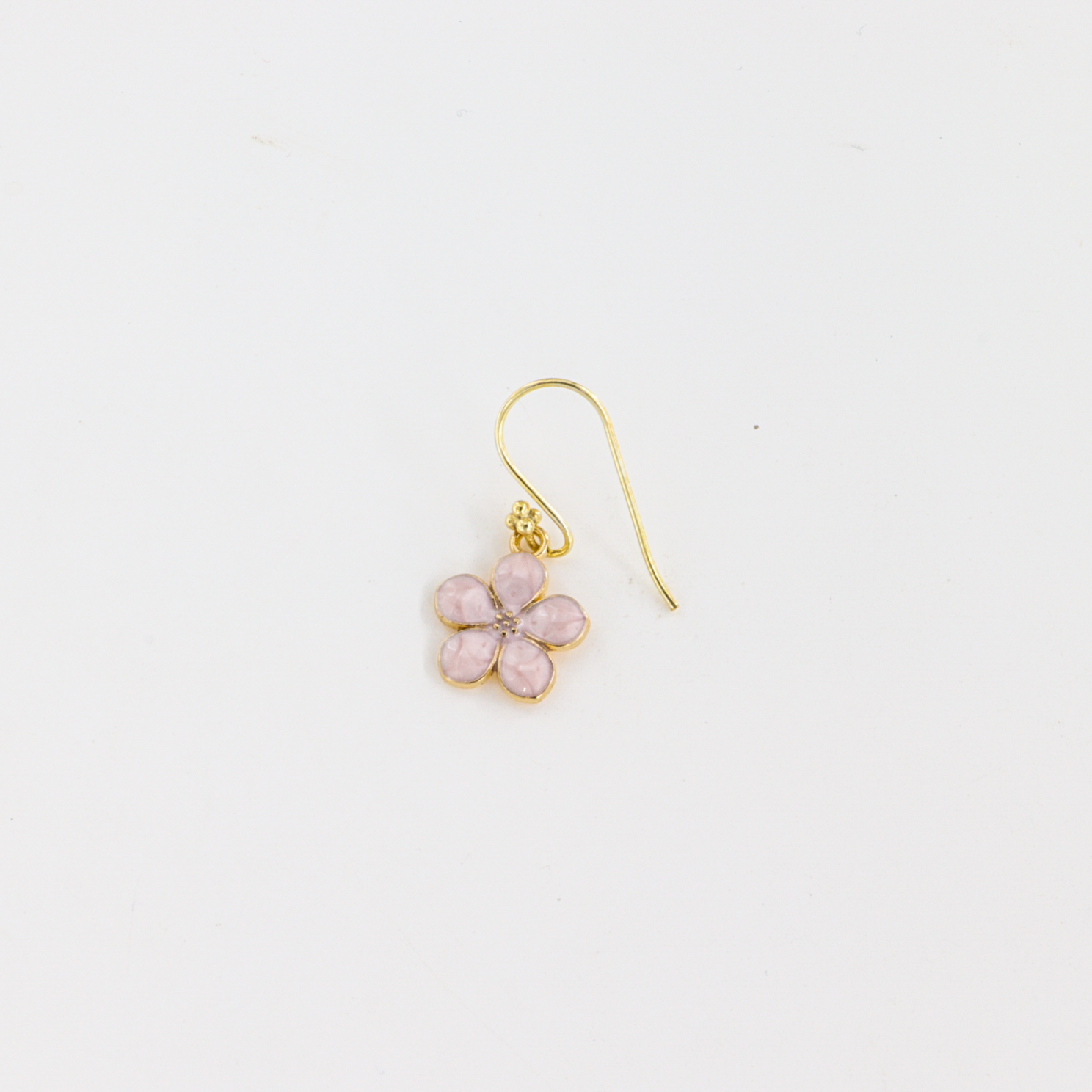 Elegant og feminin ørering med en detaljeret emaljeblomst i forgyldt messing, monteret på en ørebøjle i forgyldt sterlingsølv. Øreringen måler i alt 30 mm i længden og kombinerer smukt det klassiske og det legende udtryk – perfekt til både hverdag og fest.