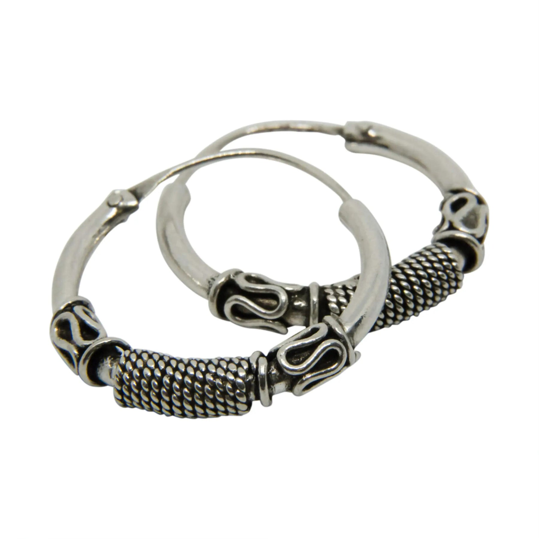 Oplev skønheden i vores unikke hoops, der er designet med et etnisk inspireret præg og fremstillet af oxideret sterlingsølv. Disse smukke øreringe præsenterer en perfekt kombination af snoet vikling og bølger, der tilføjer et elegant touch til enhver påklædning.