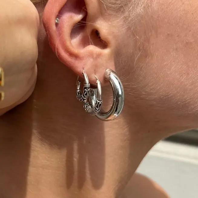 Disse hoops kan styles alene for et minimalistisk look eller kombineres med vores andre fantastiske øreringe for at skabe en personlig og iøjnefaldende stil. Uanset hvordan du vælger at bære dem, vil de helt sikkert tiltrække opmærksomhed og komplimenter.