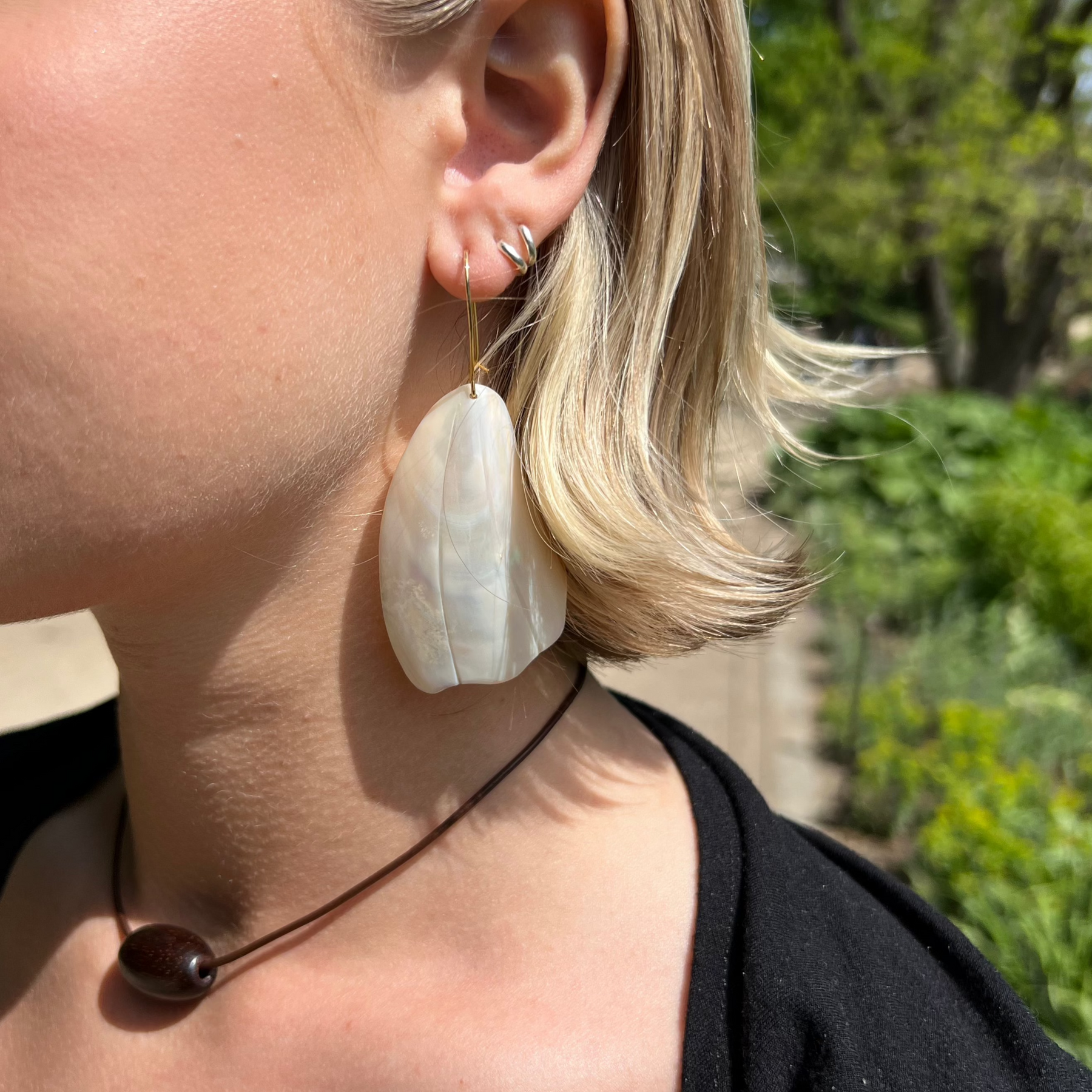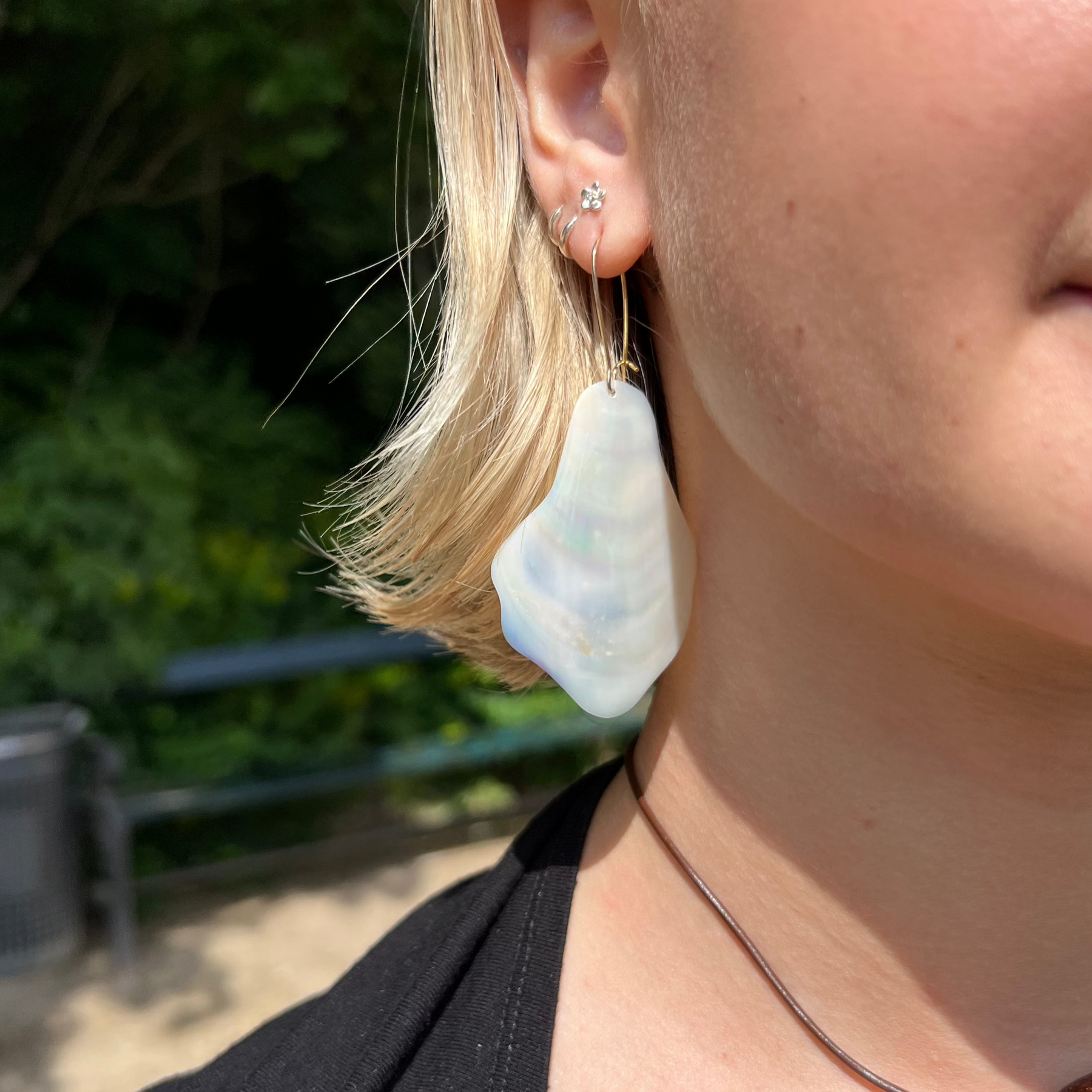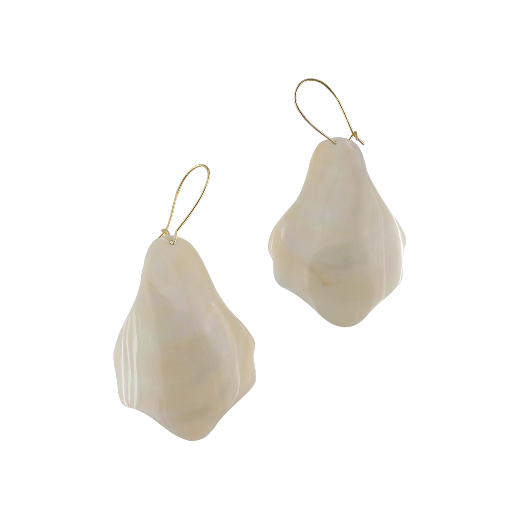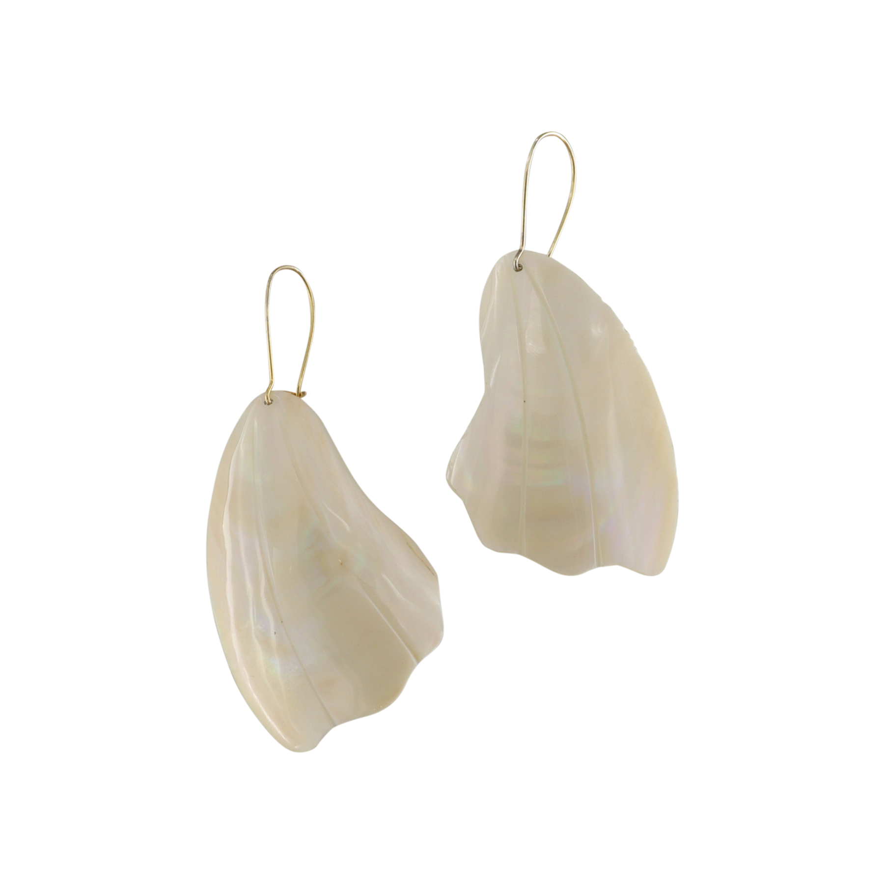 Lette, luftige og perfekte til sommer! Disse elegante øreringe består af en forgyldt messingkrog og et vedhæng udskåret i hvidlig musling, der fanger lyset med sin naturlige glans.