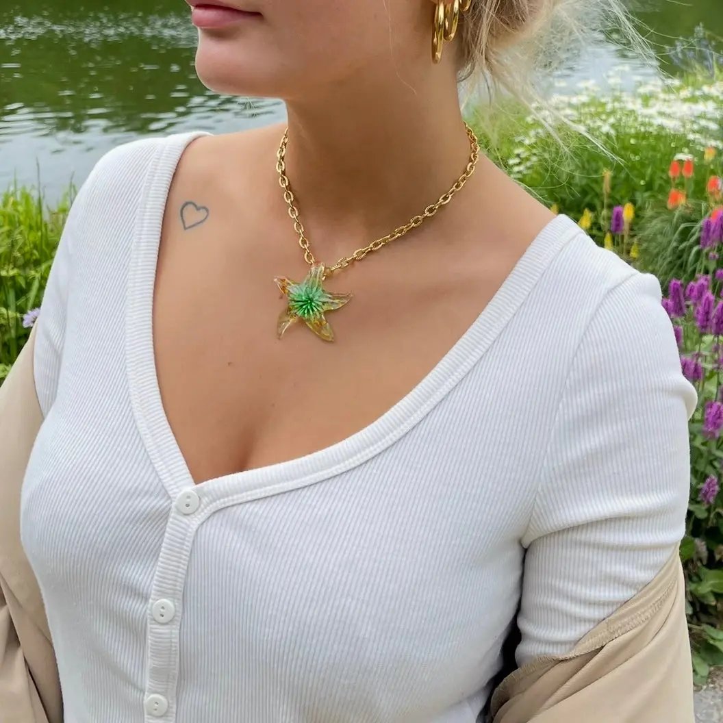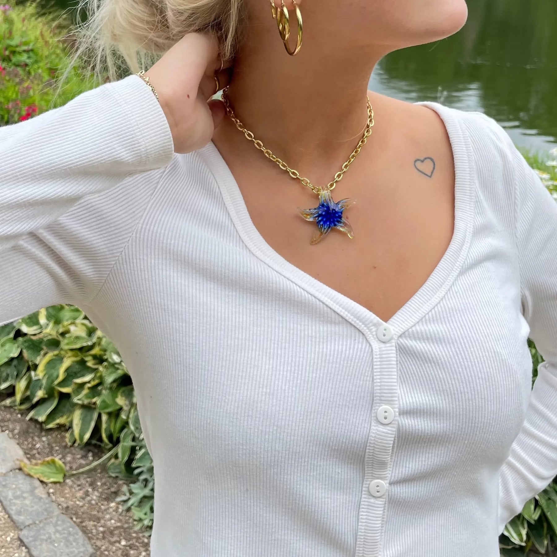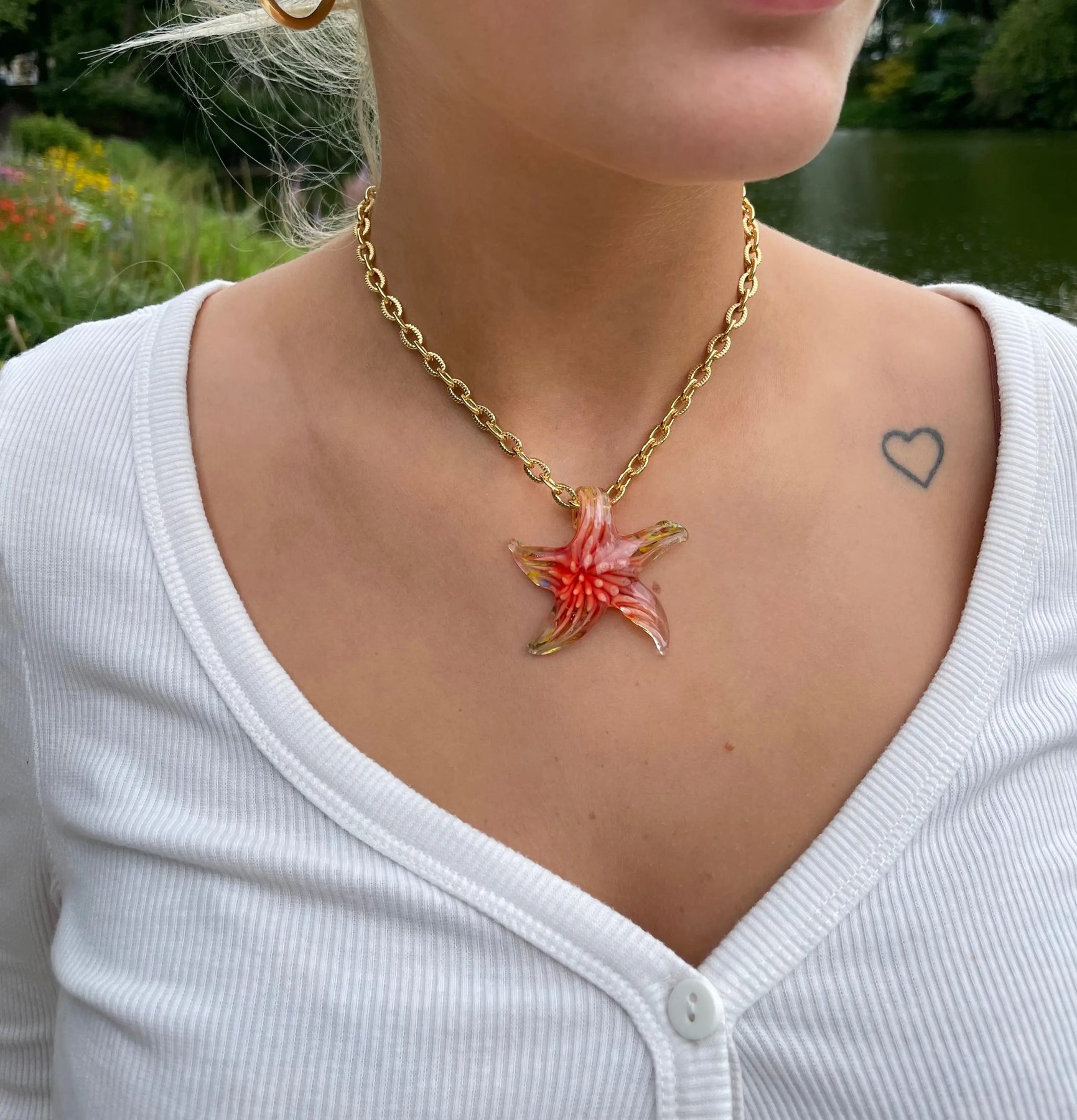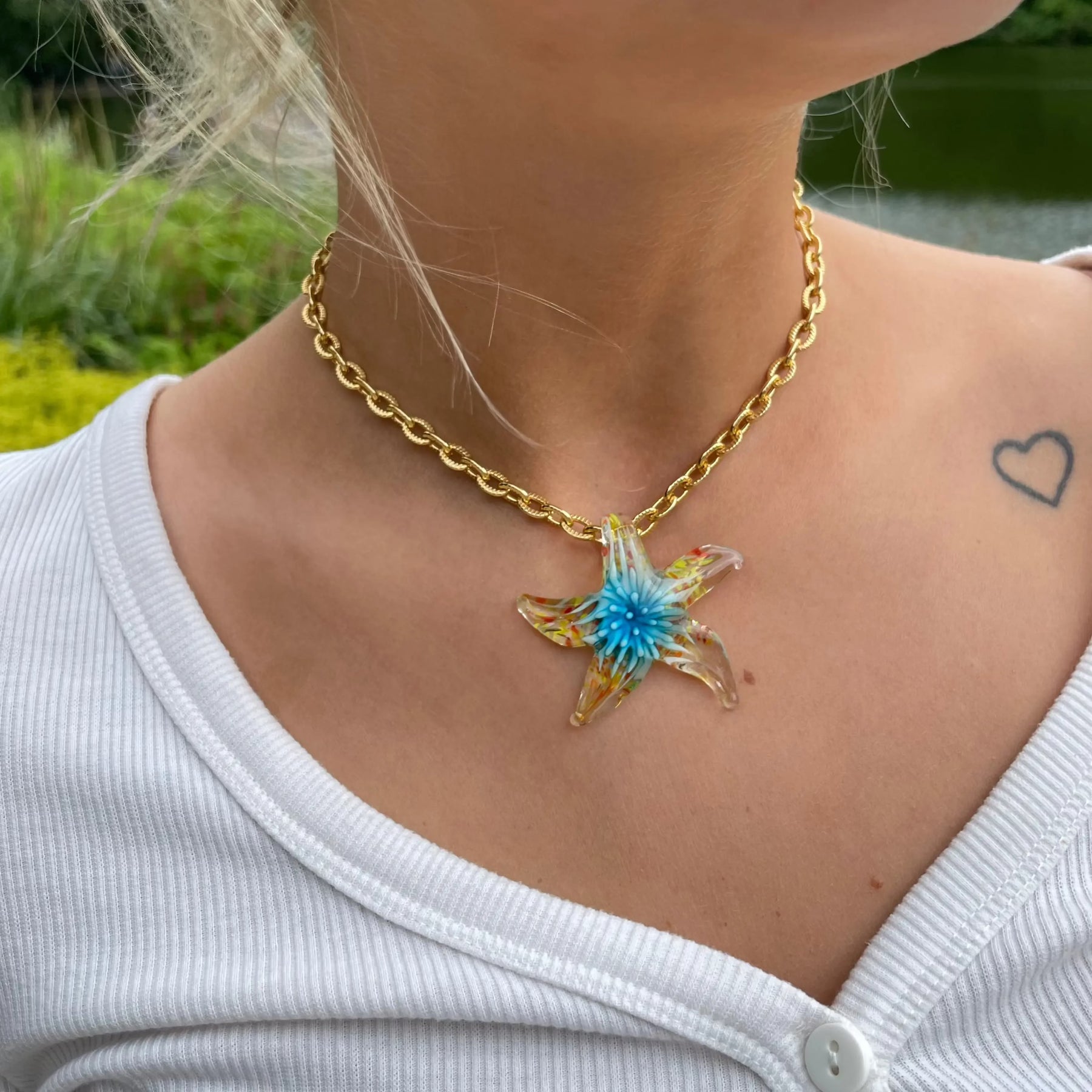 Catch the essence of the sea and summer with this beautiful turquoise starfish pendant, made in fine handmade glass. Each pendant is uniquely shaped, ensuring that no two pendants are completely similar.