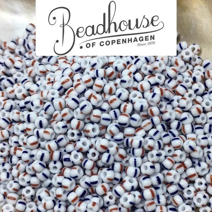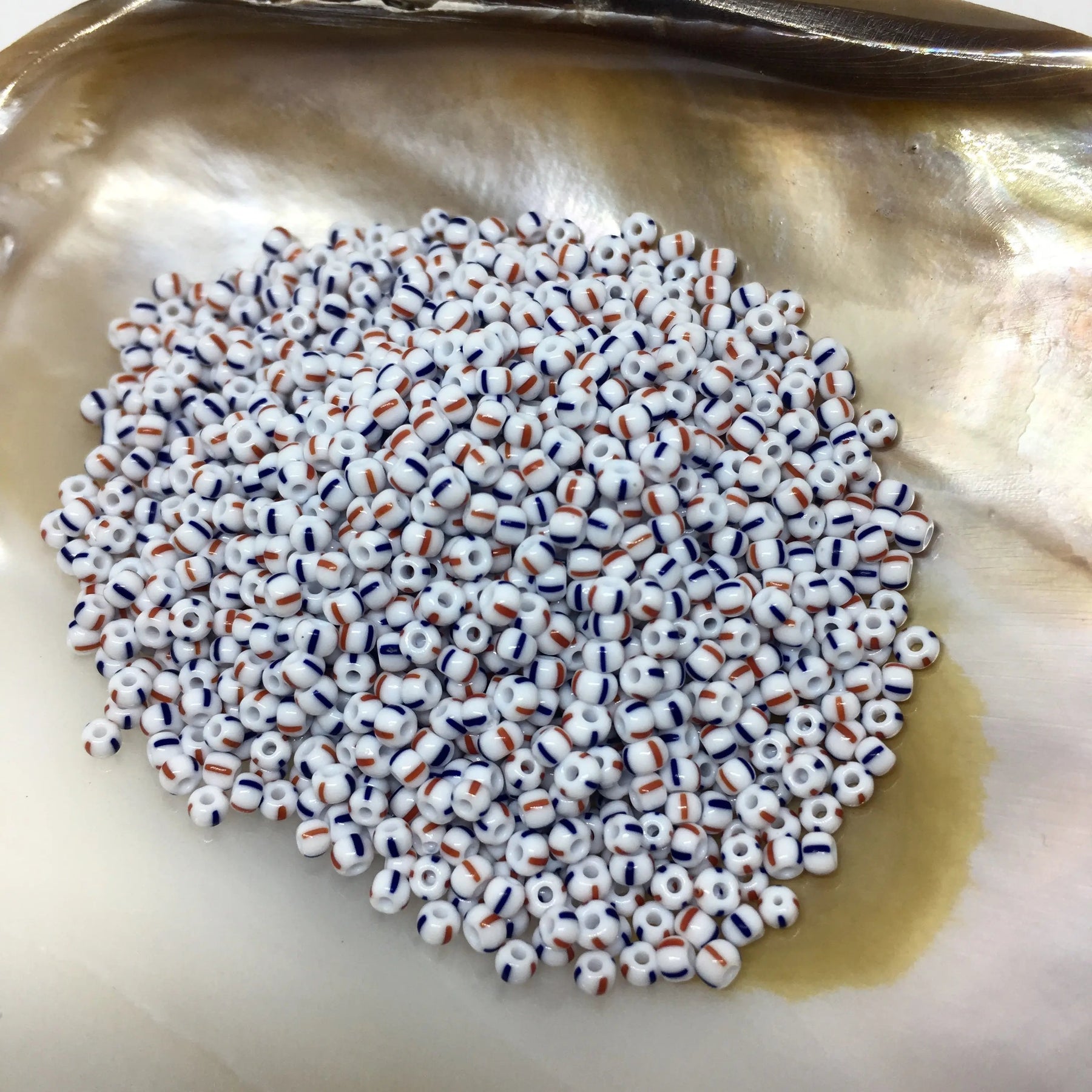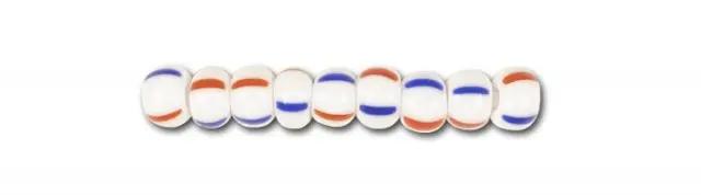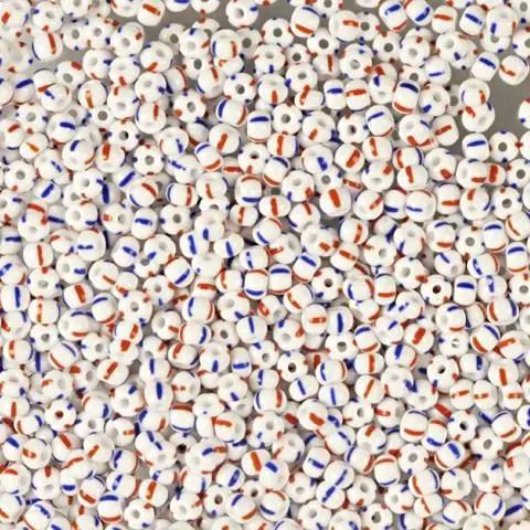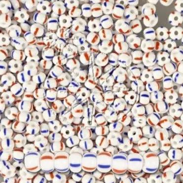 Small white glass beads with two red and two blue stripes on each.