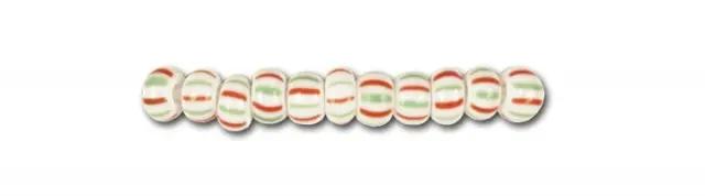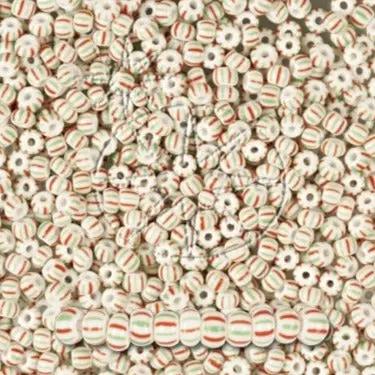 Small white glass beads with dense red and green stripes.