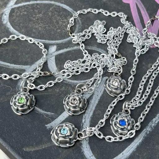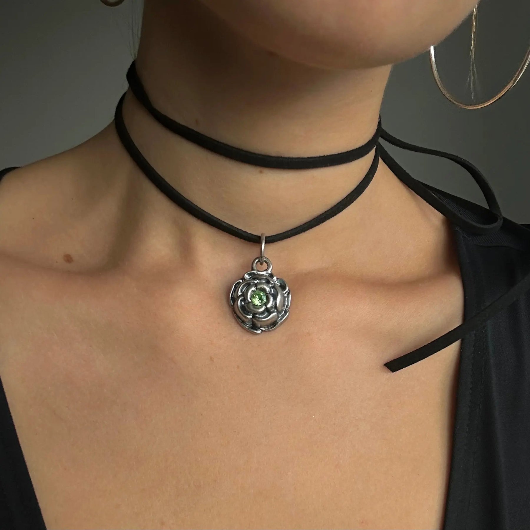 Halskæden, der er lavet af en chunky, rillet flad anker kæde i forsølvet aluminium, prydes af et rosevedhæng med farvet glas krystal. Låsen på halskæden kan justeres i alle led, så du nemt kan tilpasse længden efter dit behov. Det alsidige design gør det muligt at style halskæden alene eller kombinere den med andre smukke halskæder og vedhæng fra vores kollektion.